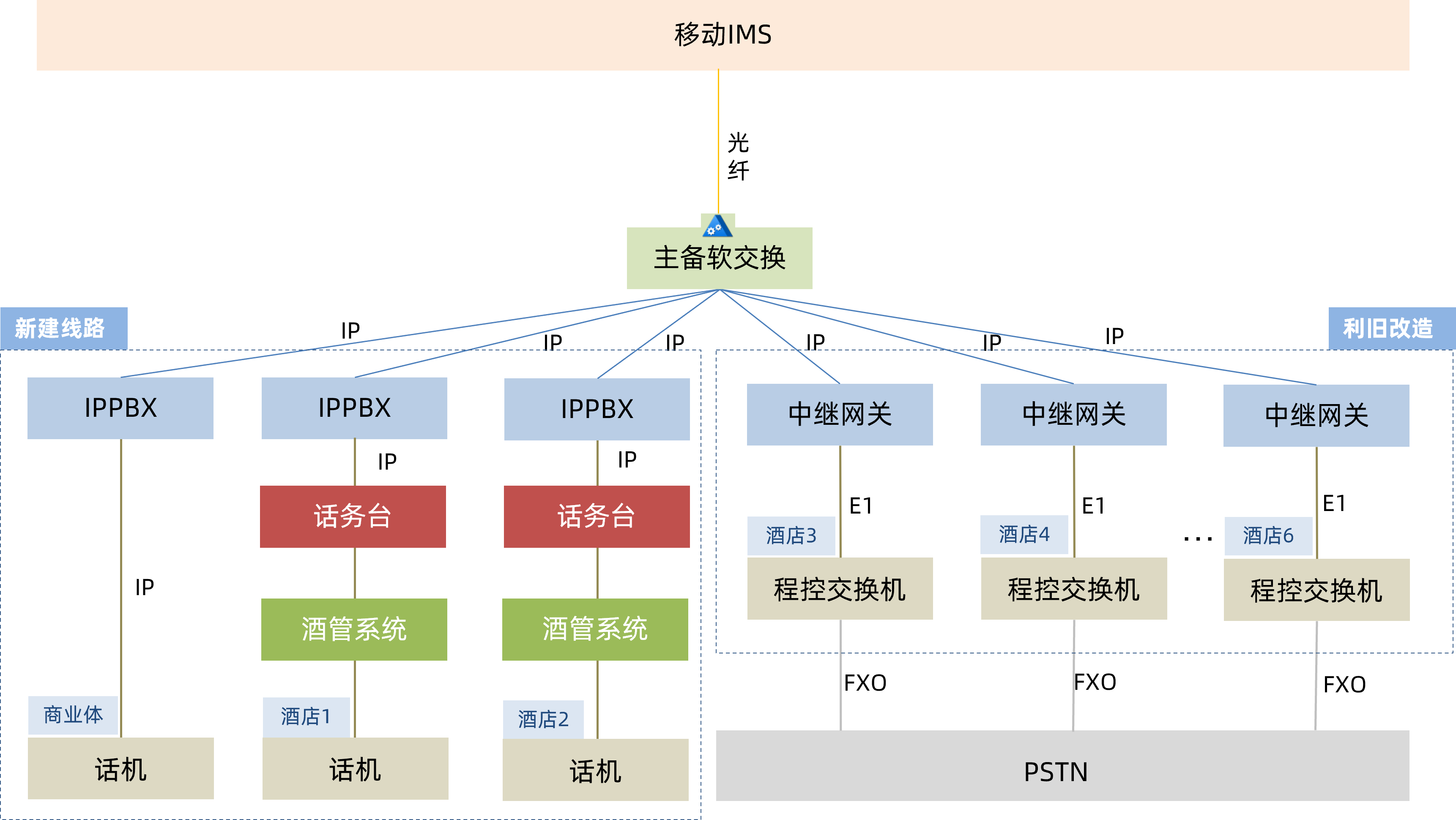 2)原有程控交换机通过麻豆传媒中继网关,实现E1信令和VoIP协议的转化,由软交换统一汇聚话务送至核心网,酒店侧保留模拟中继线接入PSTN作为应急通信手段。