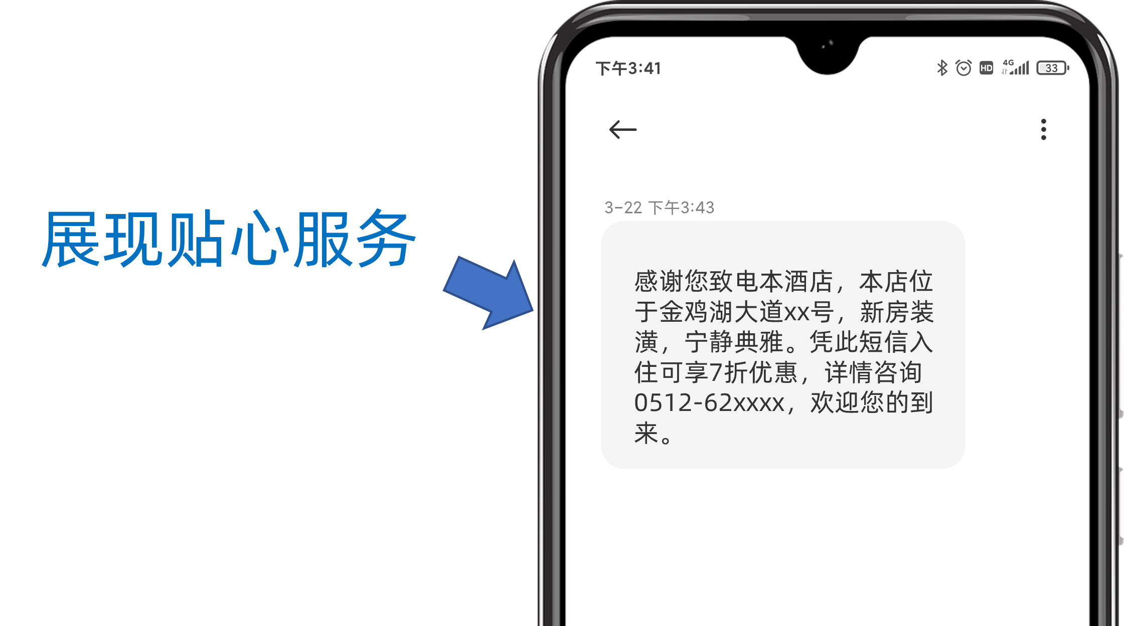 服务行业如酒店、餐饮、旅游等由于服务特性,均需要对服务人员形成宣传窗口,展现自身独特的贴心服务;挂机短信内容可自定义,满足客户客制化需求。