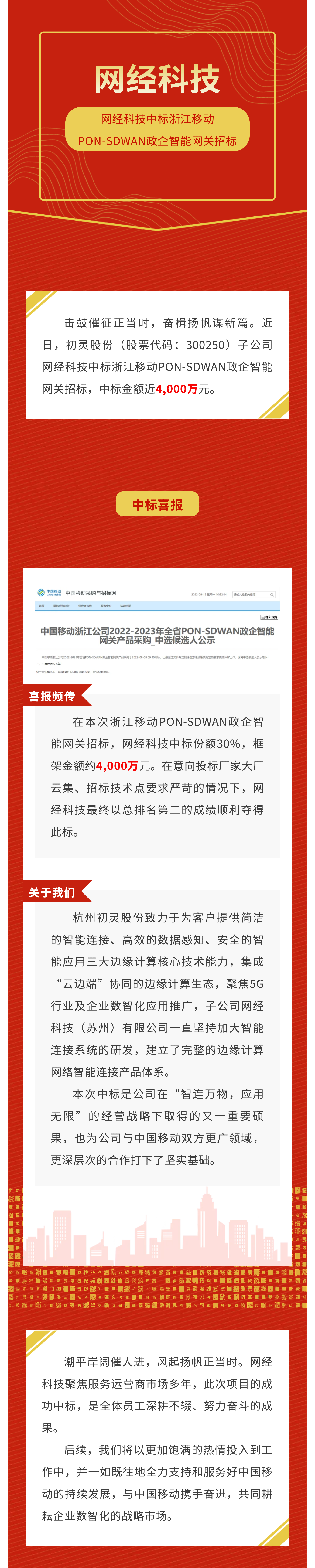中标喜报 | 初灵股份·麻豆传媒中标浙江移动PON-SDWAN政企智能网关产品采购项目