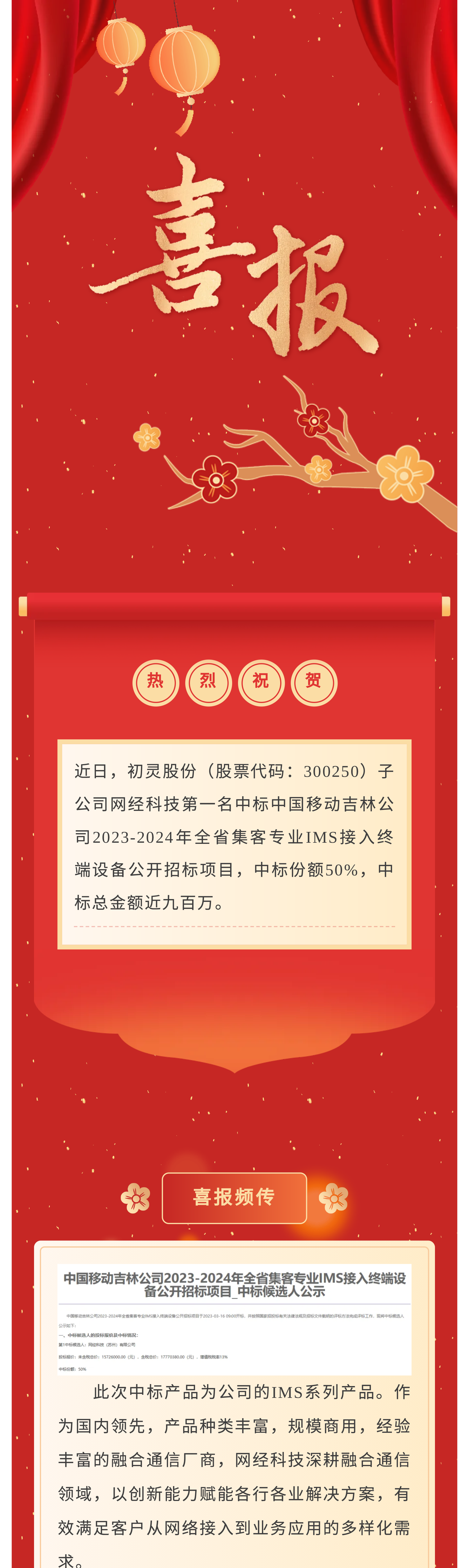 中标喜讯 | 初灵股份·智能连接·麻豆传媒第一名中标中移吉林公司全省集客专业IMS接入终端设备项目