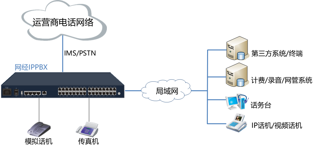 企业总机、语音导航、彩铃、来电显示、呼叫转移、转接、传真、队列、代接、热线、组呼、同振、秘书、闹钟、黑白名单、呼叫权限、三方通话、电话会议、密码拨号等。