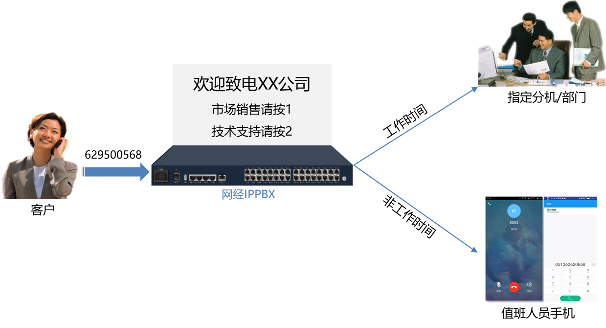 企业外部用户拨打总机时,还可为外部用户播放欢迎词和企业介绍,提升企业形象。